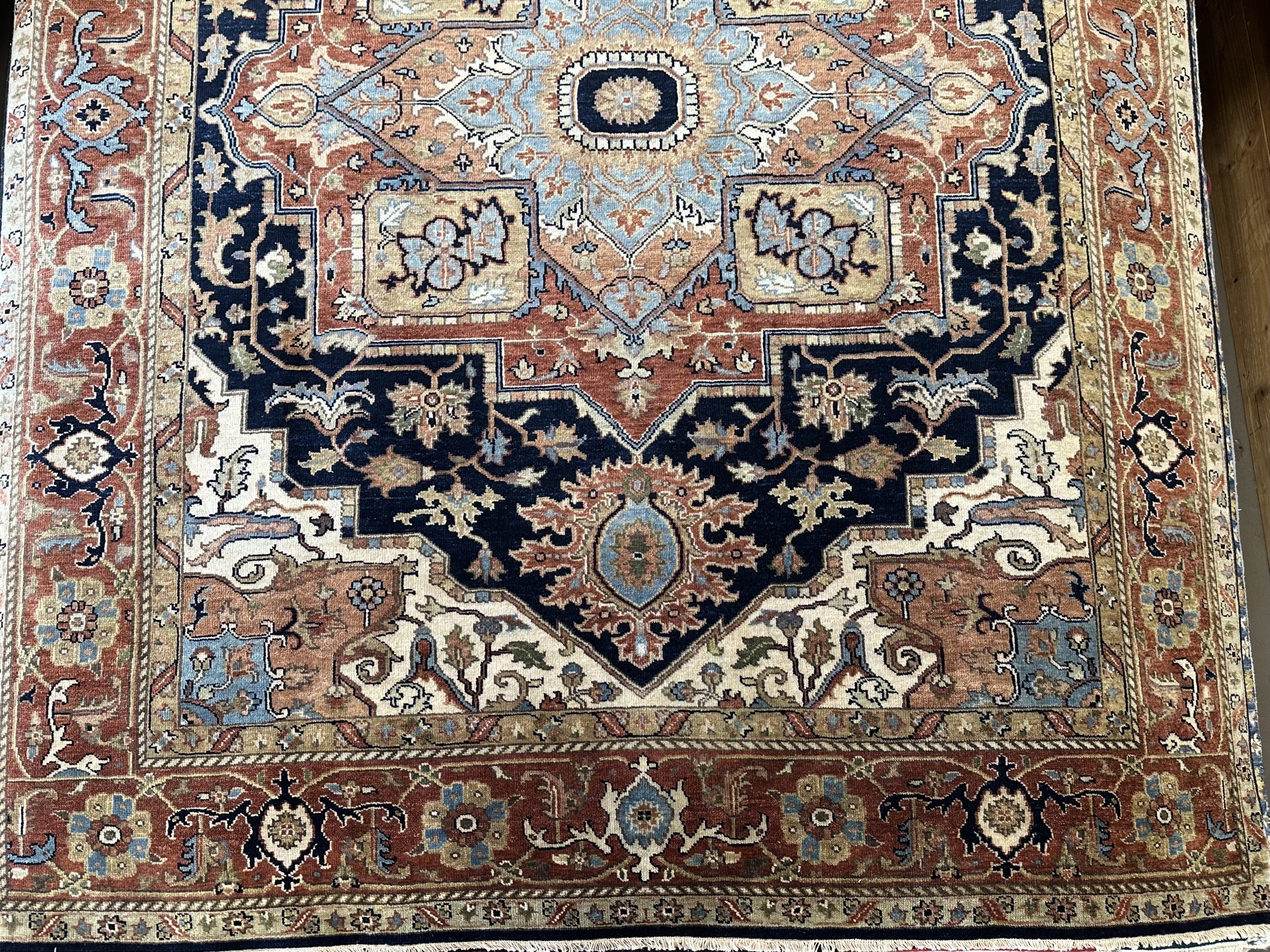 This hand knotted Indo Serapi rug lends a traditional feel to your favorite room. It carries a bold geo-floral design elements along with a pleasing balance of blue, natural and red colors.